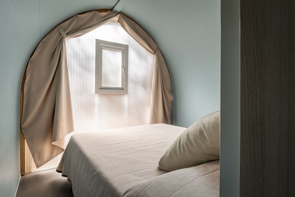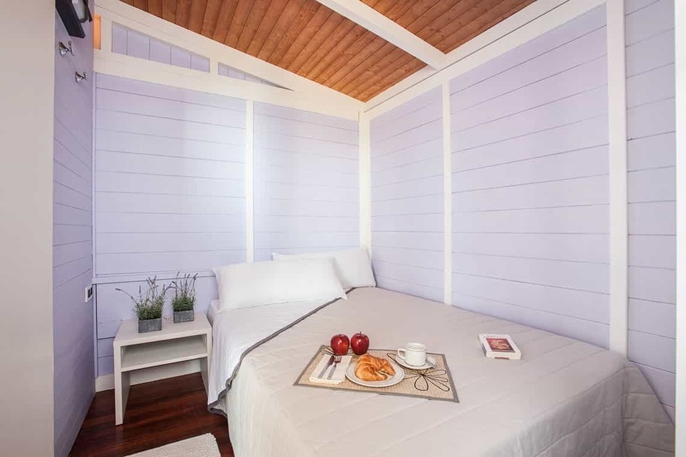 Su diseño funcional dispone de un único espacio con una cama doble, ideal para una escapada en plena naturaleza.