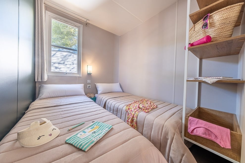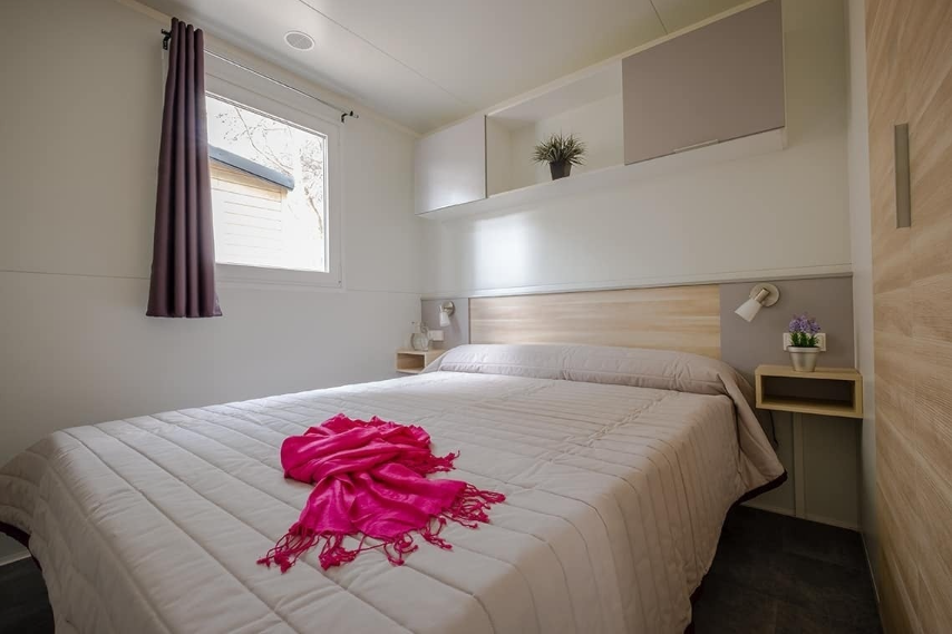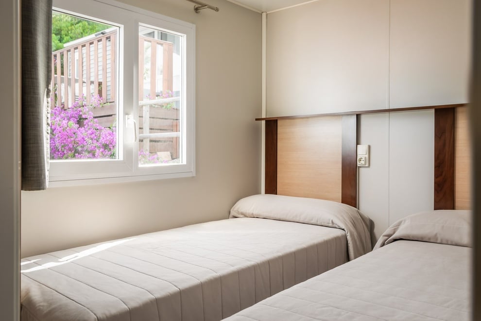 Ubicados en la zona media y alta del camping (zona bosque), este acogedor alojamiento de 16 m² ofrece un espacio funcional con capacidad para hasta 4 personas, incluyendo niños y bebés. Su distribución incluye dos habitaciones: una con cama doble y otra con dos camas individuales.