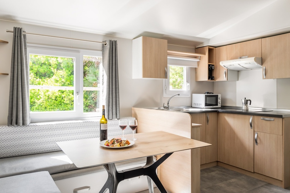 Ubicados en una área cómoda y accesible en la zona llana del camping, junto a recepción, con fácil acceso a la playa y a las instalaciones de ocio. Este alojamiento de 32 m² renovado en 2025, ofrece un espacio acogedor con capacidad para un máximo de 5 personas, incluyendo niños y bebés.