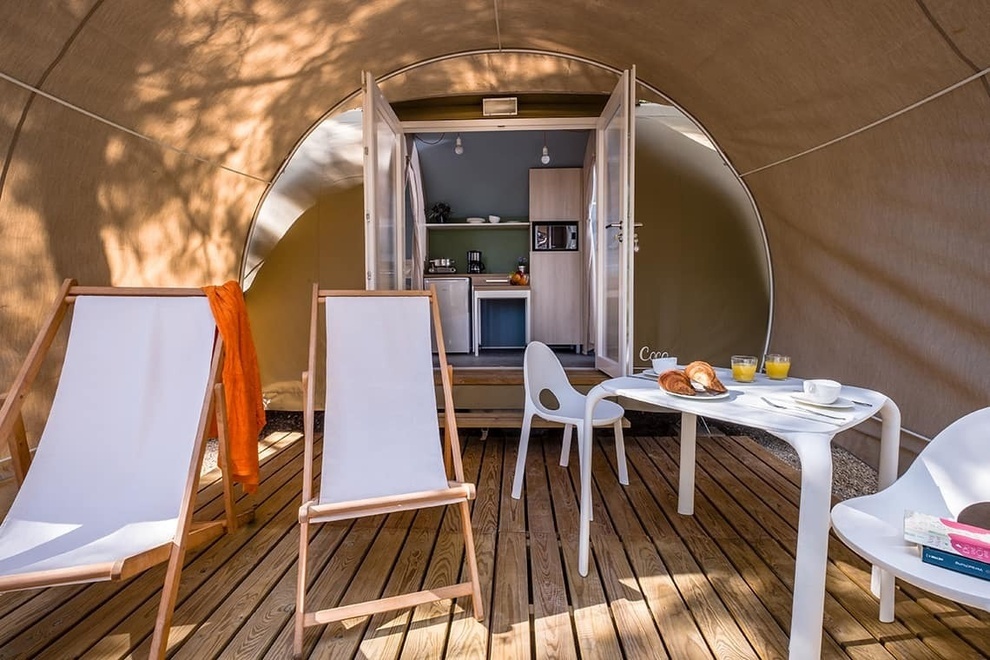 Situado en una ubicación privilegiada sobre el acantilado, esta tienda de 40m² con vistas al mar, ofrece un espacio acogedor y funcional para hasta 4 personas (incluyendo adultos, niños y bebés).