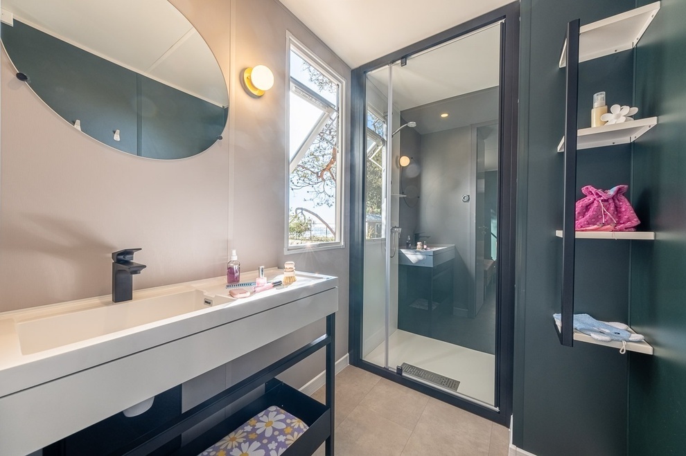 Ubicado en una zona privilegiada del camping, con acceso directo a la playa a menos de 50 metros y junto a todos los servicios principales (recepción, restaurante, supermercado…), este alojamiento de 45 m² (35 m² interiores 10 m² de terraza) ha sido completamente renovado en 2024 para ofrecer un espacio moderno y confortable.