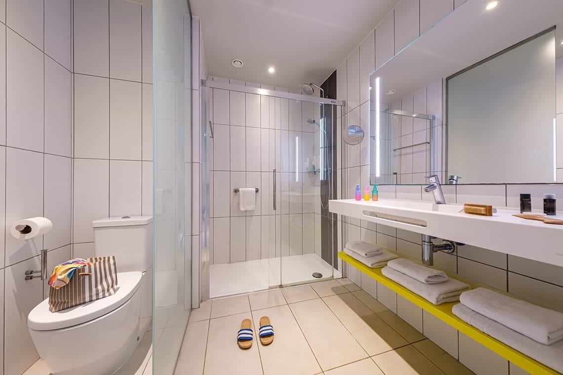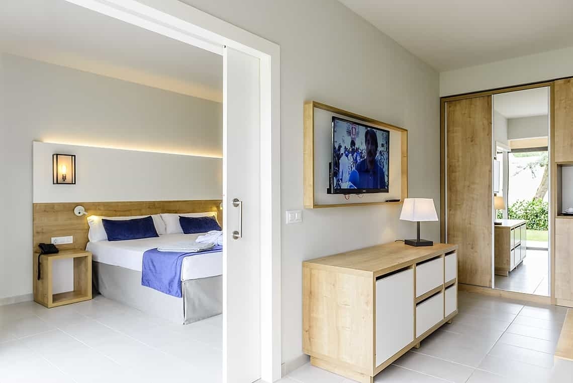 Room from 45 m² to 50 m² with views of the resort. It has two separate rooms, bedroom and living room. The bedroom has a 2 meter x 2 meter bed and TV. The living room is equipped with a double sofa bed and TV. It has a full bathroom and all the amenities to guarantee a pleasant stay. This room stands out for its spaciousness and luminosity, it is decorated with soft tones and contemporary style furniture.