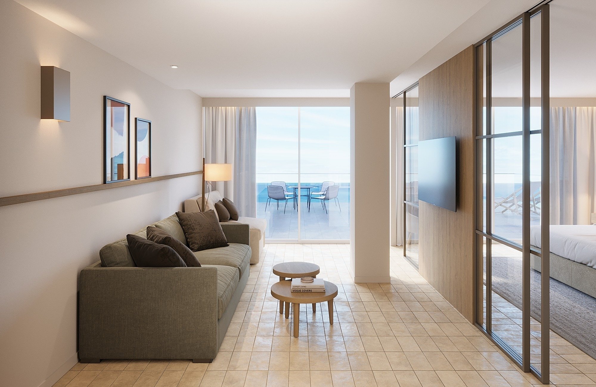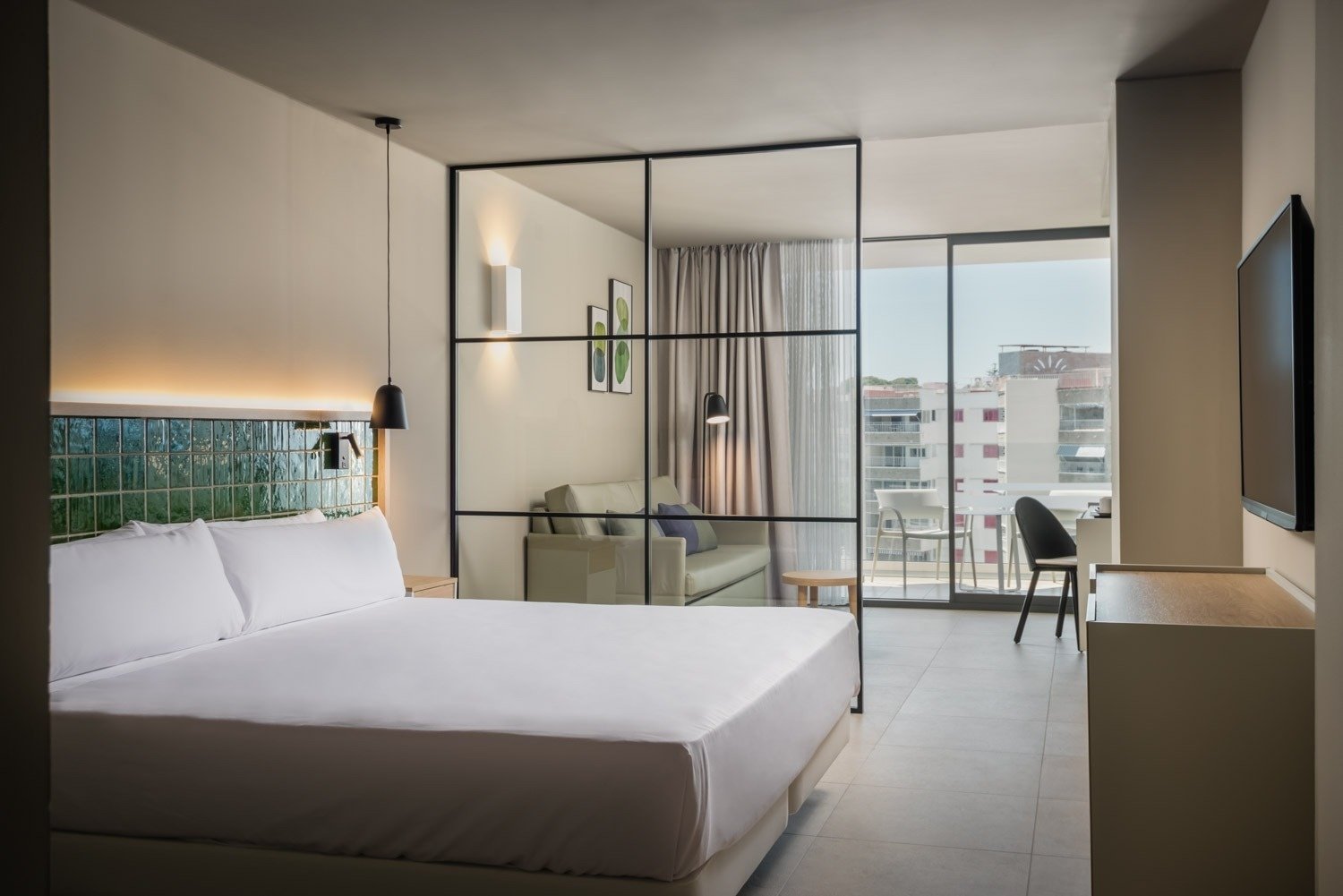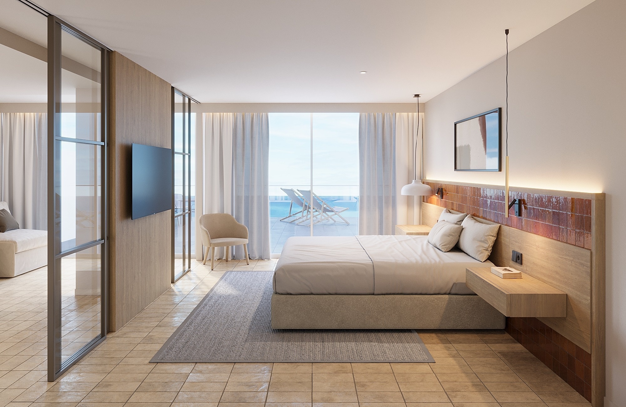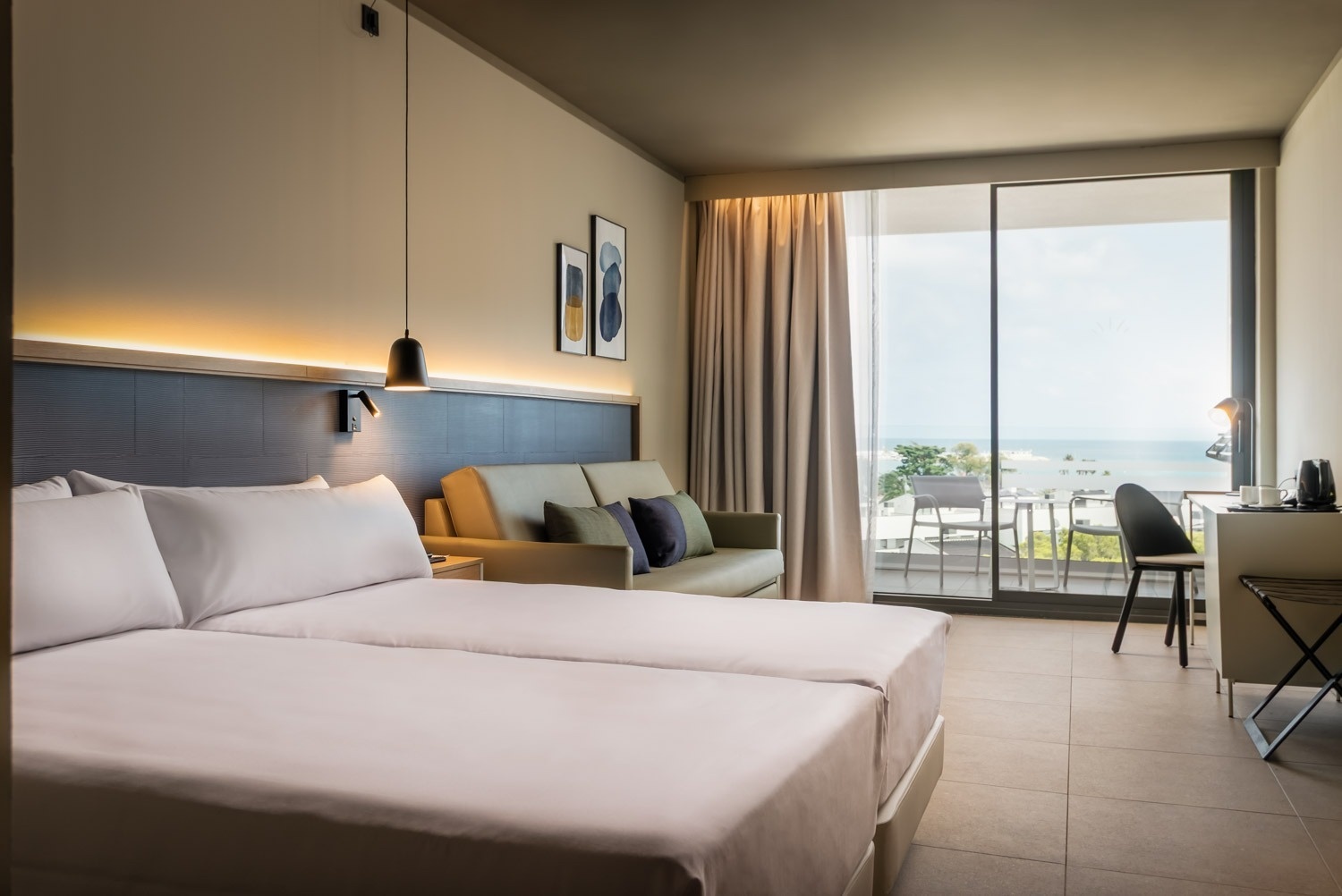 Room of 50 – 60 m² with terrace and sea views. It has a separate living room and bedroom to provide a larger space. It has a double bed and two single beds, a sofa bed and an extra bed, as well as a complete bathroom with a shower, to ensure rest and comfort during your stay.