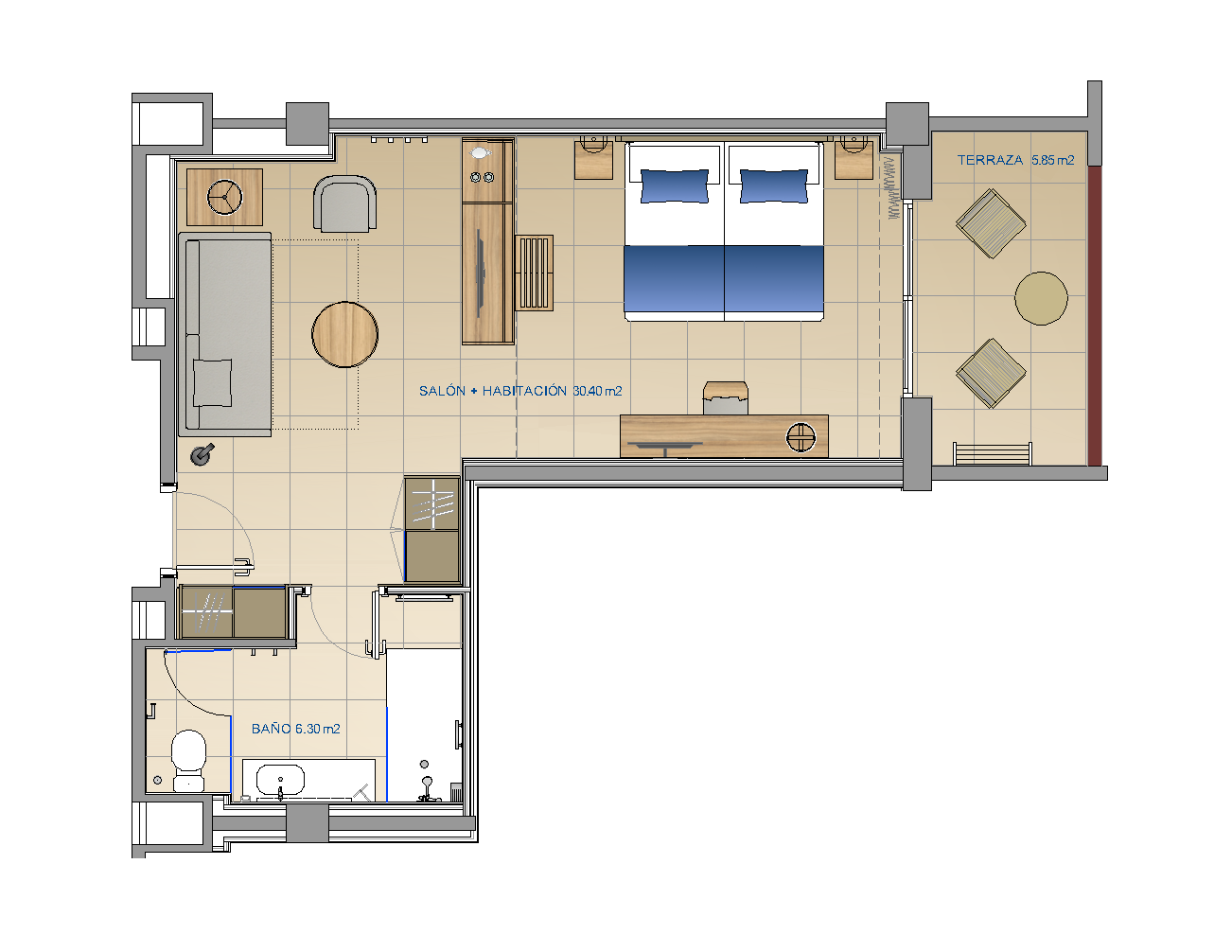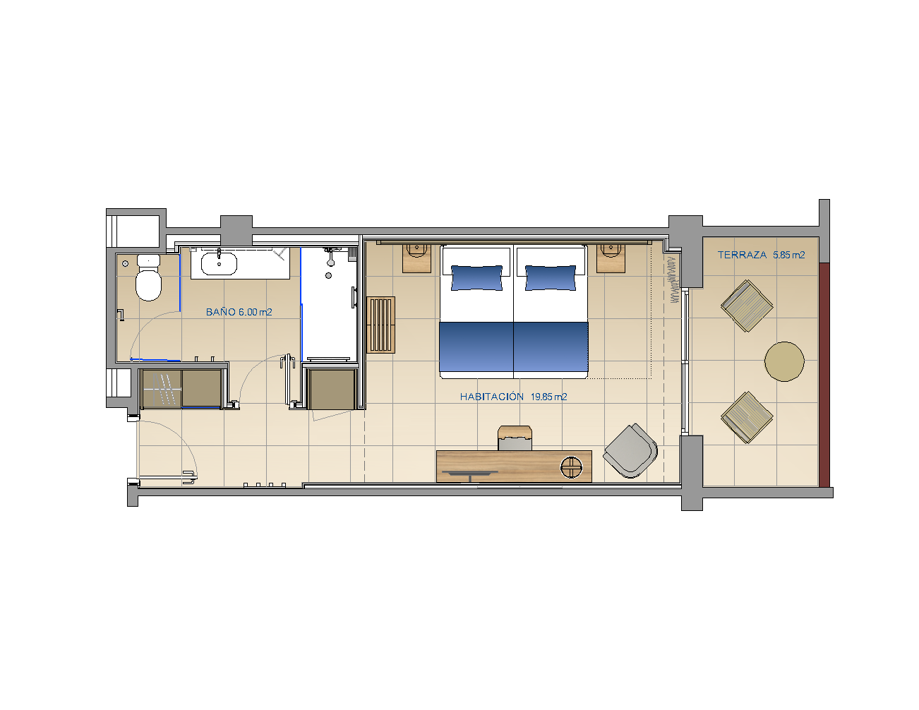 Habitación de 25.85 m² y una terraza amueblada de 5.85 m². Cuenta con dos camas separadas y un cuarto de baño completo, todo diseñado para brindarle una estancia sumamente confortable.