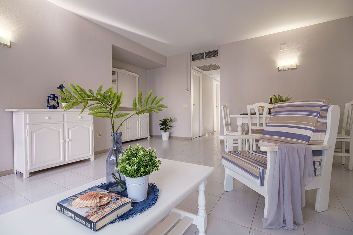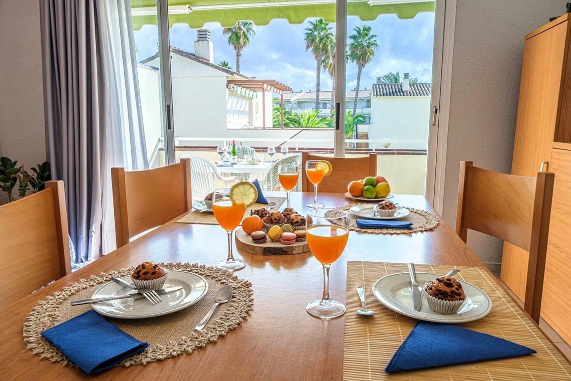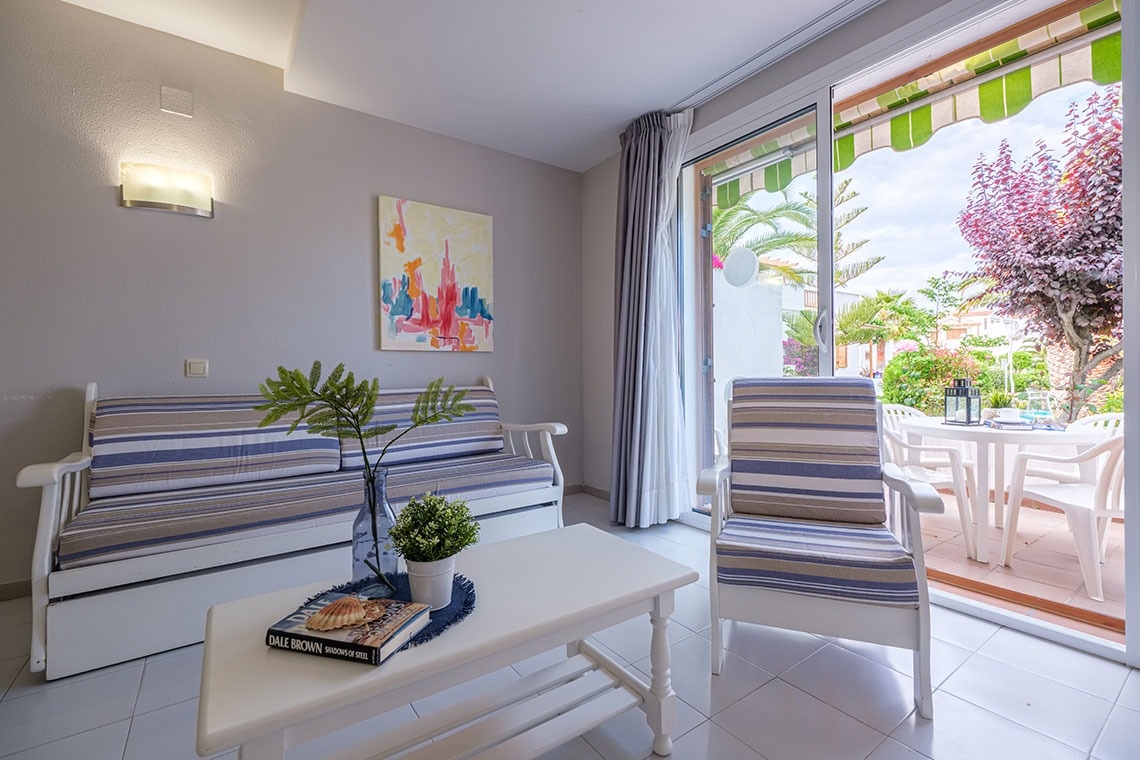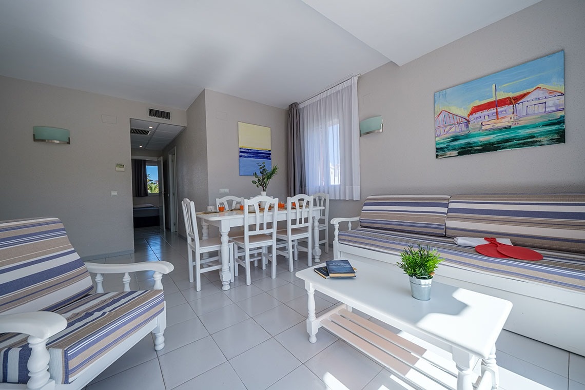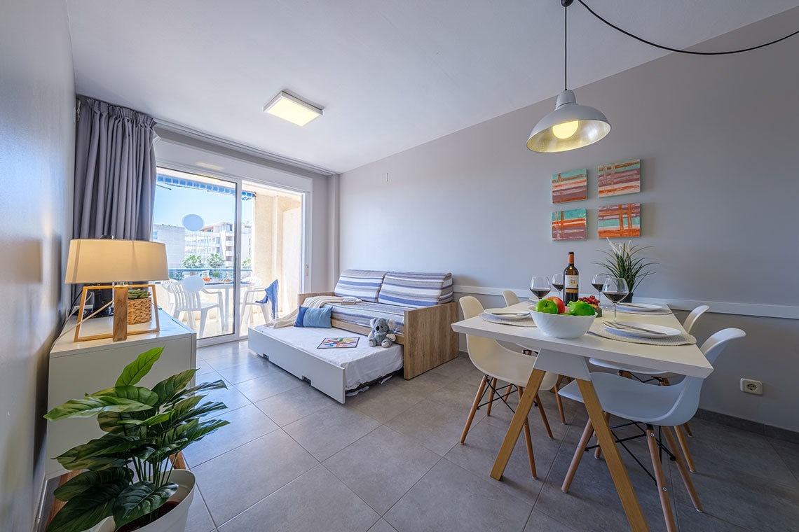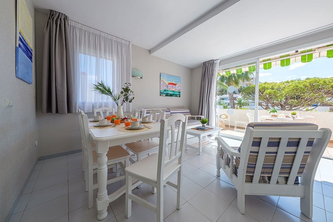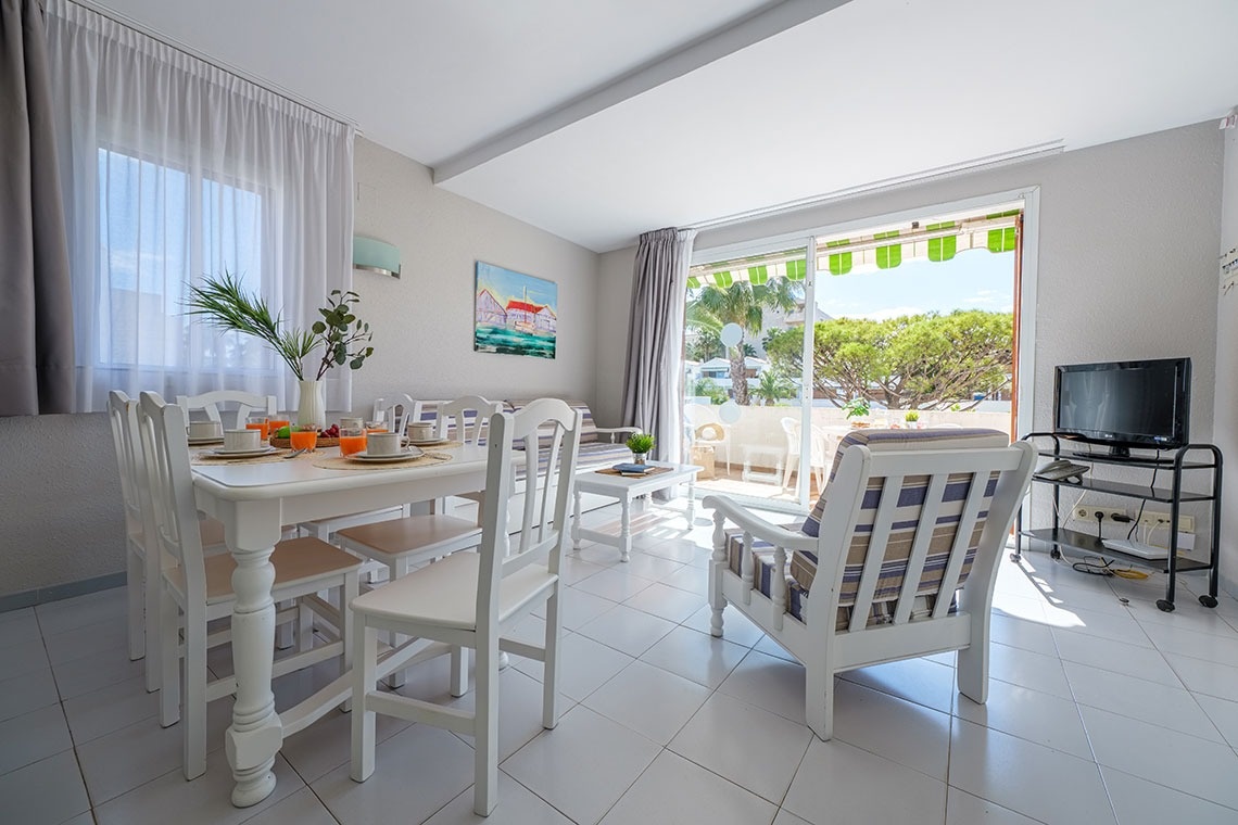 Apartamento de 55 m², que cuenta con dos habitaciones, cada una equipada con dos camas individuales. Además, dispone de un acogedor salón-comedor con un sofá cama, una mesa acompañada de cuatro sillas y una terraza amueblada. Están equipados con todas las comodidades necesarias para que se sienta como en su segunda casa en la Costa Daurada. Los apartamentos 4/6 se ubican en la planta baja o en la primera planta, accesibles por escaleras.