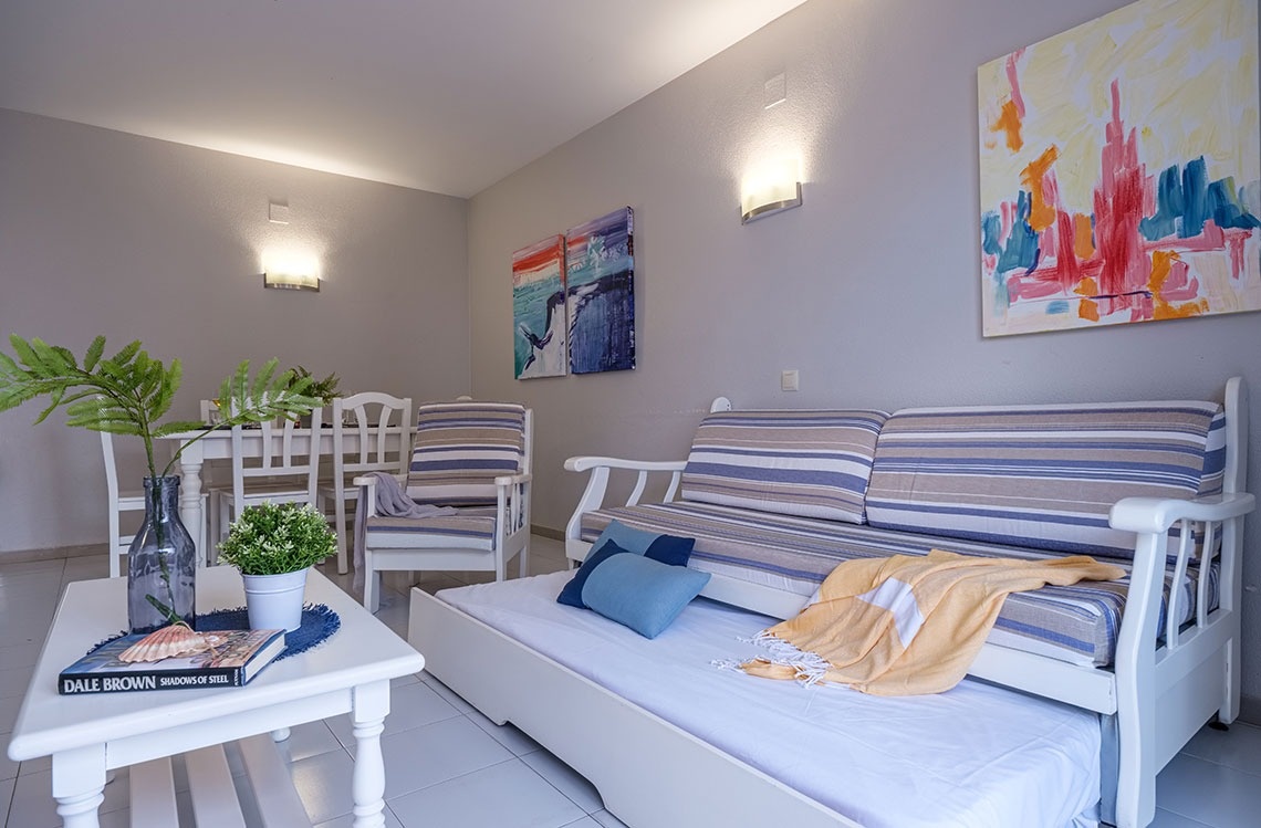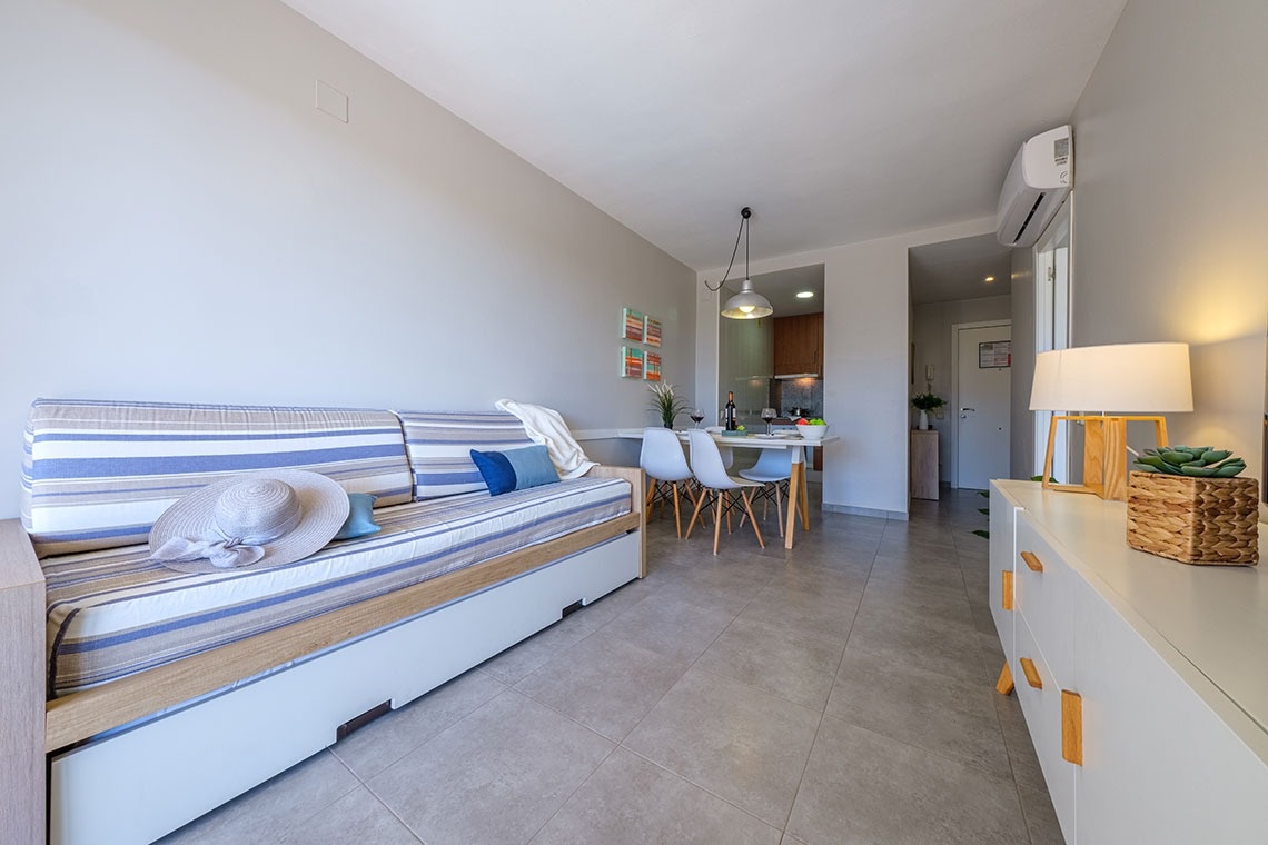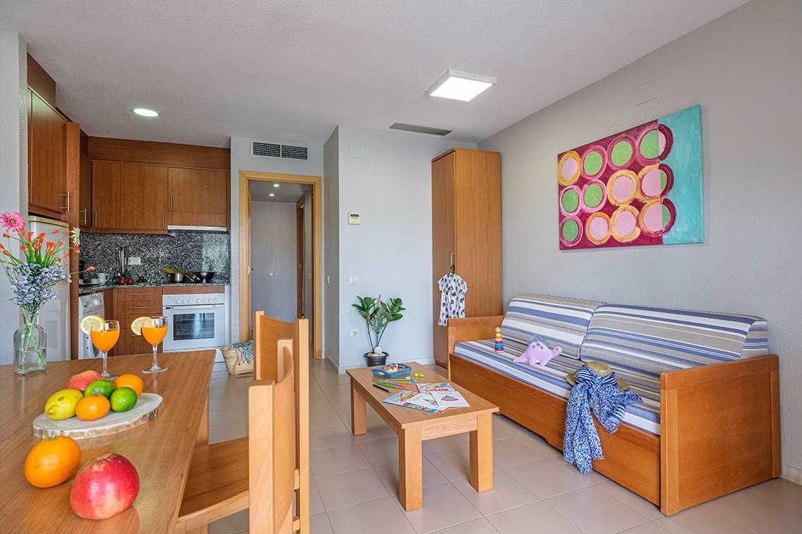 Apartamento de 45 m², que consta de una única habitación con dos camas individuales, un acogedor salón-comedor con un sofá cama, una mesa acompañada de cuatro sillas, y una terraza amueblada. Están equipados con todas las comodidades necesarias para que se sienta como en su segunda casa en la Costa Daurada. Los apartamentos 2/4 se encuentran en la segunda planta, accesible por escaleras, a excepción de aquellos ubicados en la zona residencial fase 9, que se encuentran en un edificio de cinco plantas con ascensor.