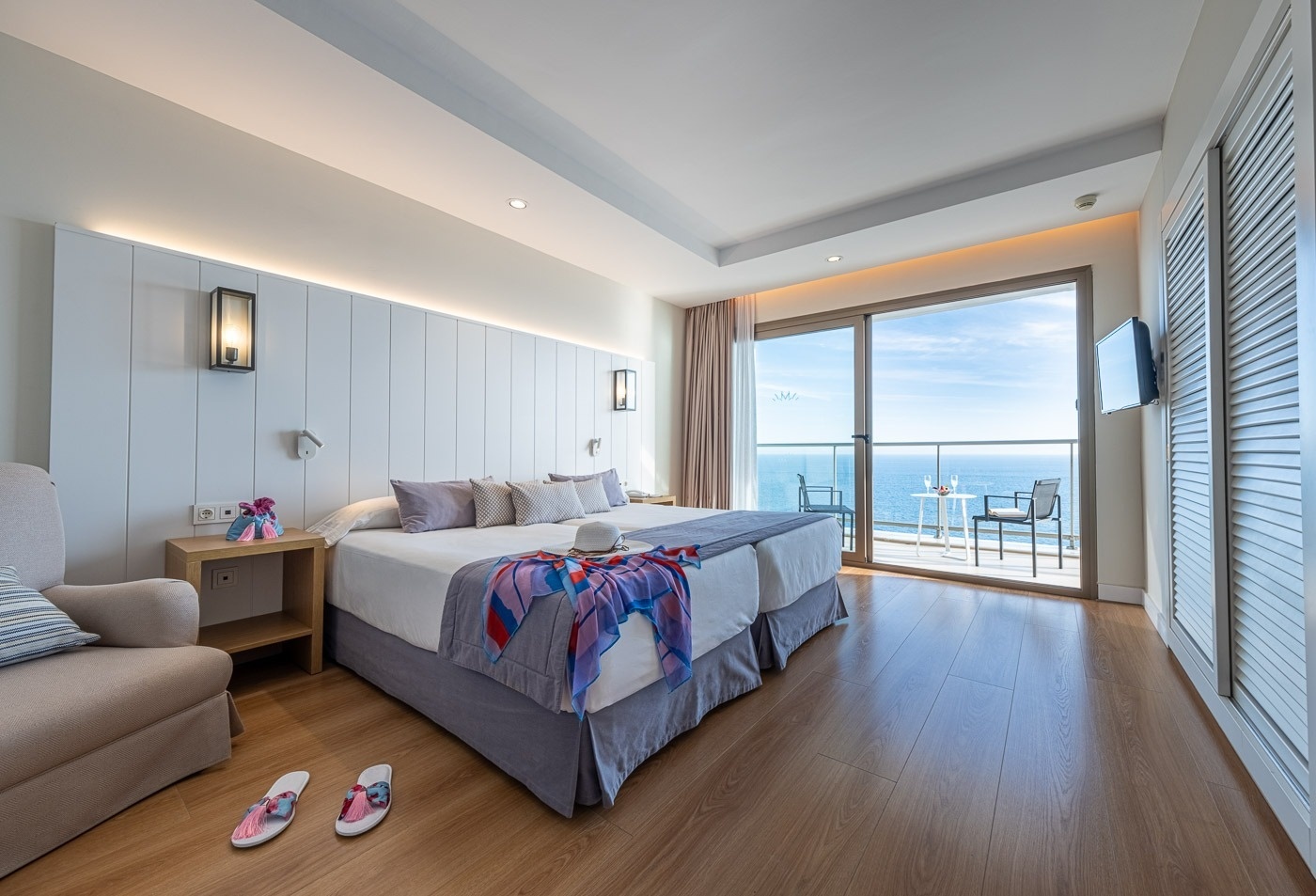 Habitación de 72 m² con balcón y vistas al mar, con capacidad máxima para 2 adultos y 2 niños. La Suite Presidencial es la estancia más sofisticada del hotel, con dos dormitorios, dos baños y una sala de estar con sofá. Además, está decorada con un estilo moderno y ofrece los servicios más exclusivos, diseñada para satisfacer todas las necesidades de los huéspedes que buscan una experiencia única.