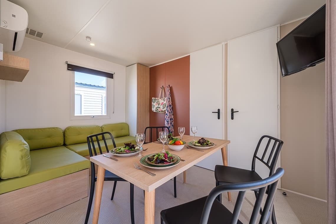 Côté équipements, le mobil home dispose d'une cuisine entièrement équipée pour préparer toutes sortes de repas et d'une terrasse aménagée avec une table et 5 chaises.